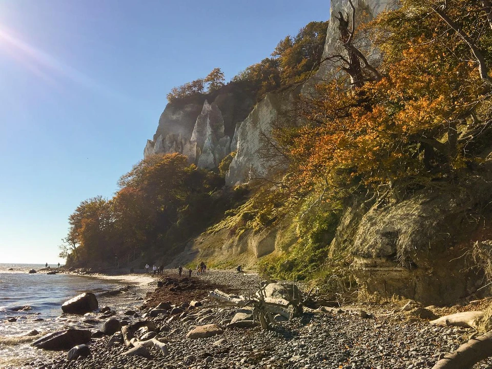 Fra toppen af Møns Klint er der flere steder, hvor det er muligt at komme ned til stranden. Her kan I nyde den storslående klint nedefra og lede efter fossiler og kridt langs den smukke kyststrækning.
