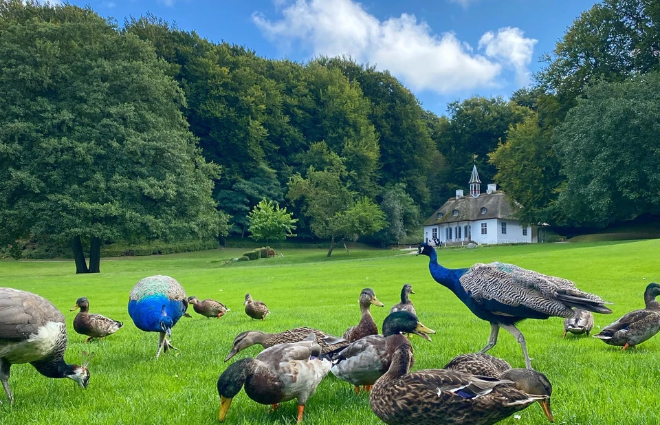 Her kan I fodre ænder og nyde synet af de de smukke påfugle, der går frit rundt i haven året rundt.